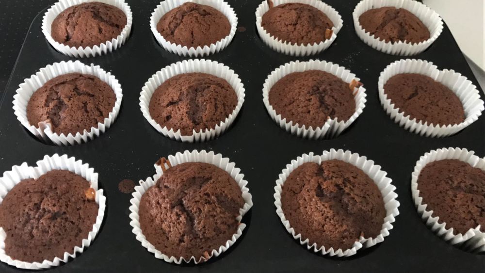 So, heat the oven to 170 degrees and add muffin cases to a 12 cup muffin tin.