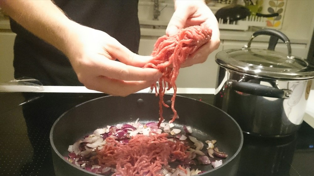 Roughly chop the onions and dice the carrots. Heat oil in a large frying pan, preferably with a lid. Add the onions and brown slightly. Add the mince. Don’t just lob a slab of mince in there, if you take a bit of time and pull it apart as you add it, you’ll find it ends up having a much more even texture.