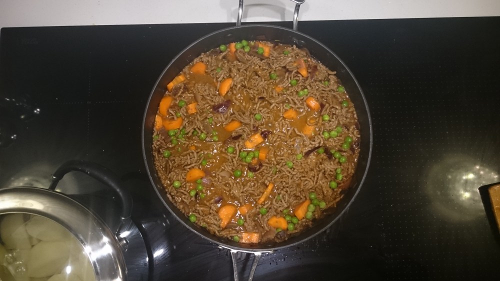 Sprinkle over the flour and mix in so all the beef is coated. Then add the stock, the carrots and the peas. Stir well, cover and simmer on a medium heat. Stir occasionally.