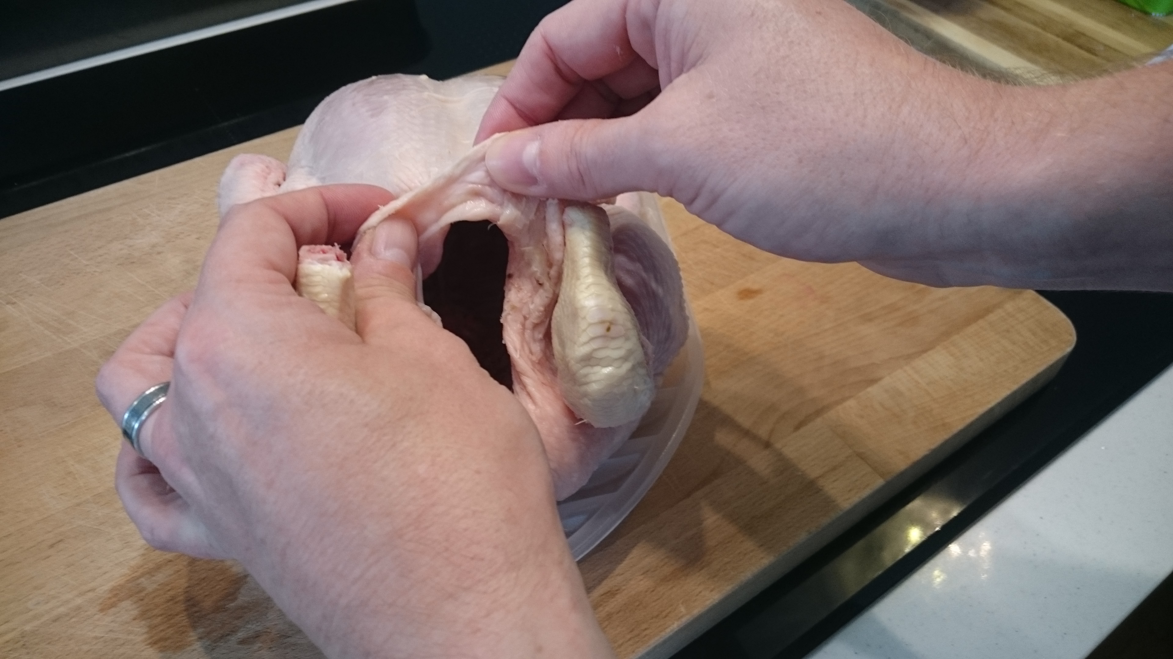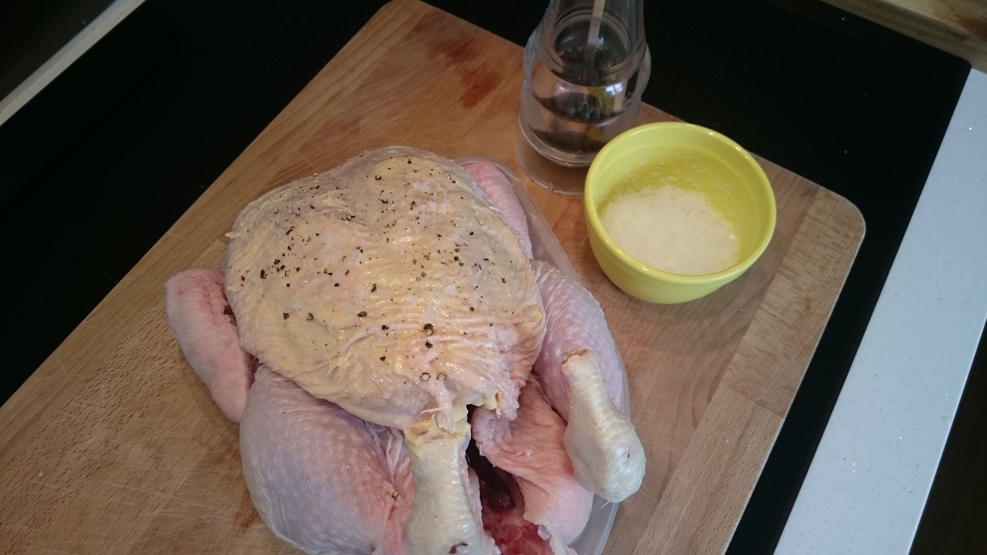 Preheat your oven and get a large roasting tin ready. Take your chicken out of its packaging and do not wash it (most chickens will say this on them now). Take 100g of softened butter and mix with a liberal sprinkling of salt and pepper. You can add a couple of crushed garlic gloves if you like garlic.