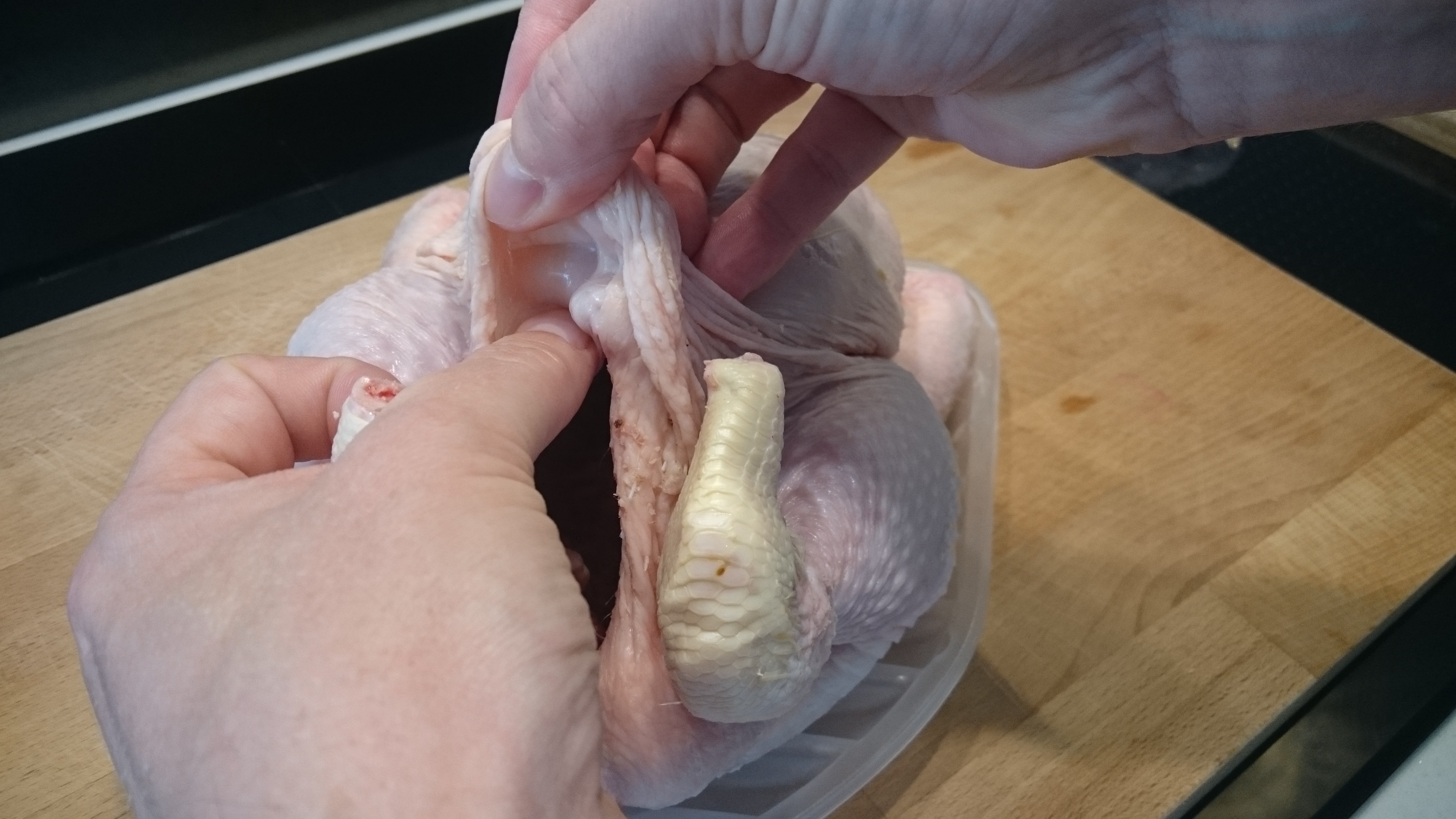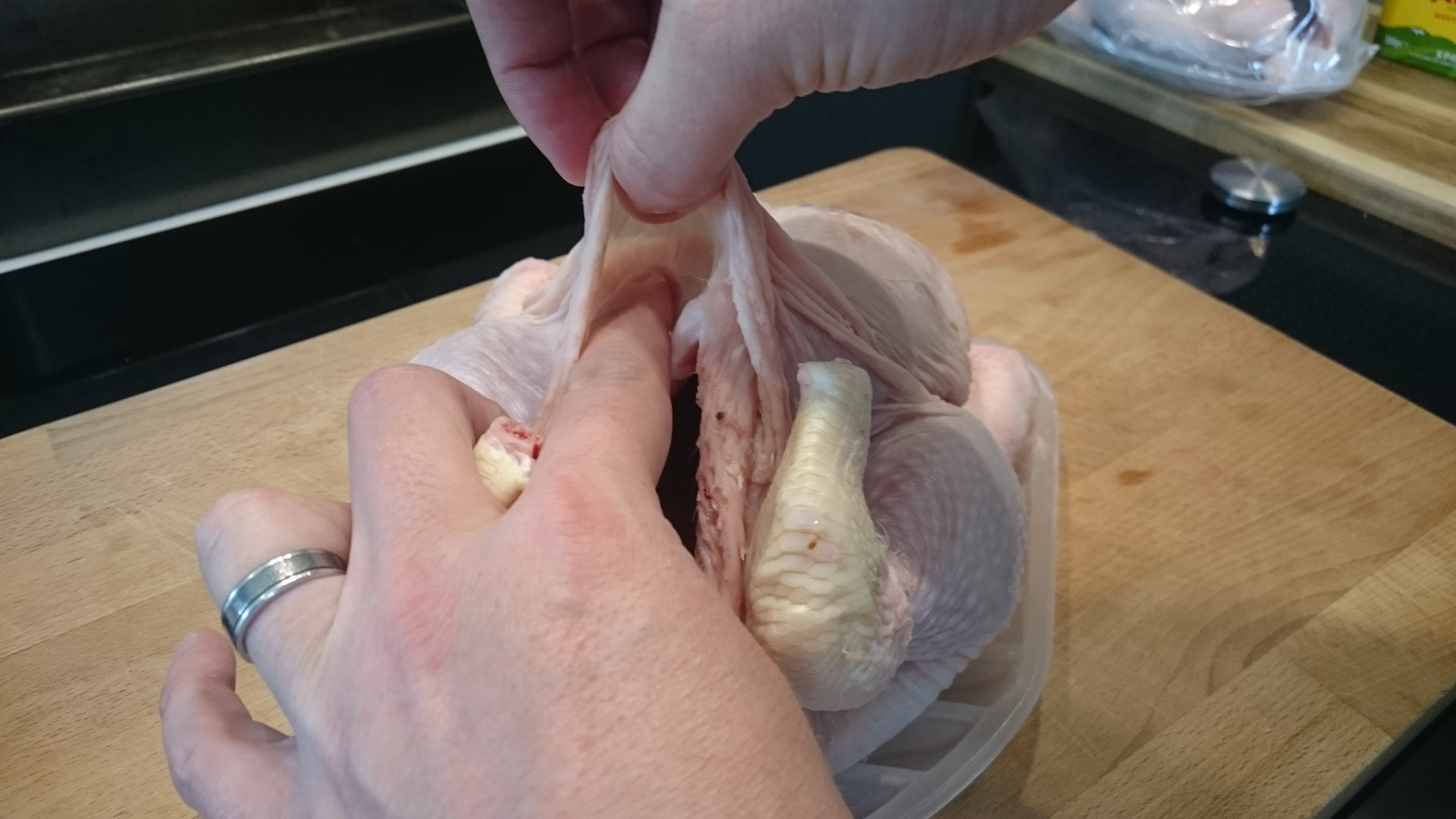 Now, cut or prize the skin at the bottom of the breast away from the meat. Push your fingers in to create a sizeable pocket under the skin on both sides of the breast. Then stuff the majority of the butter mix under the skin, pushing right over the top of the breast. Rub the remaining butter onto the top of the skin, sprinkle more salt and pepper on the skin and place the chicken in the roasting tin.