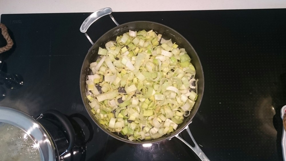 Peel and slice the leeks and gently fry in a large deep frying pan with the garlic, butter and flour until they are well coated and quite soft. Add the milk (or milk/cream blend) and vigourously stir to ensure there are no lumps of flour or anything sticking to the pan. Heat for around four minutes whilst it all thickens, stirring all the time.