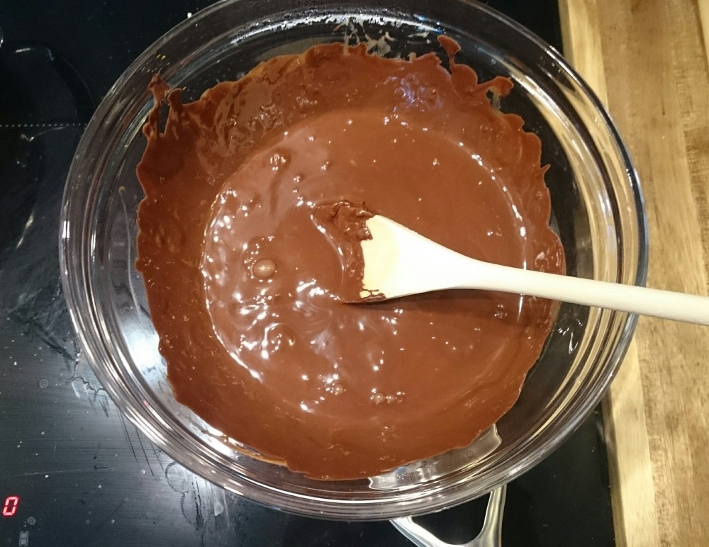 Whisk in the egg yolks to the chocolate. After this, stir in the sugar and cocoa, mixing well. Then fold in the egg whites a third at a time, making sure you don’t over mix.