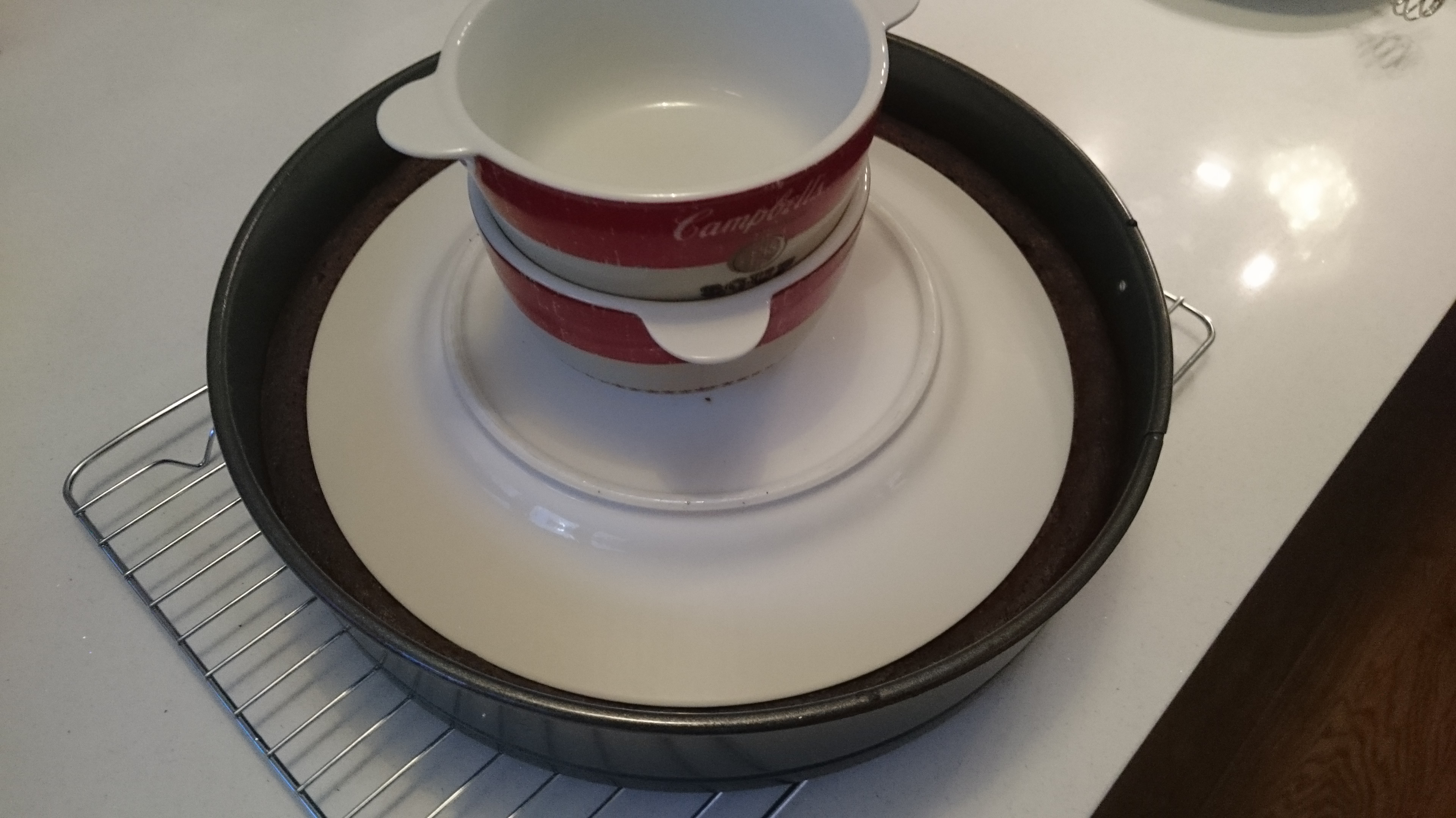Take out the oven and put the whole tin on a cooling rack. Put a dinner plate of similar size to the tin, upside down on top of the cake and weight it down with a couple of soup or dessert bowls on top. Leave this in place for ten minutes while the cake is squashed.