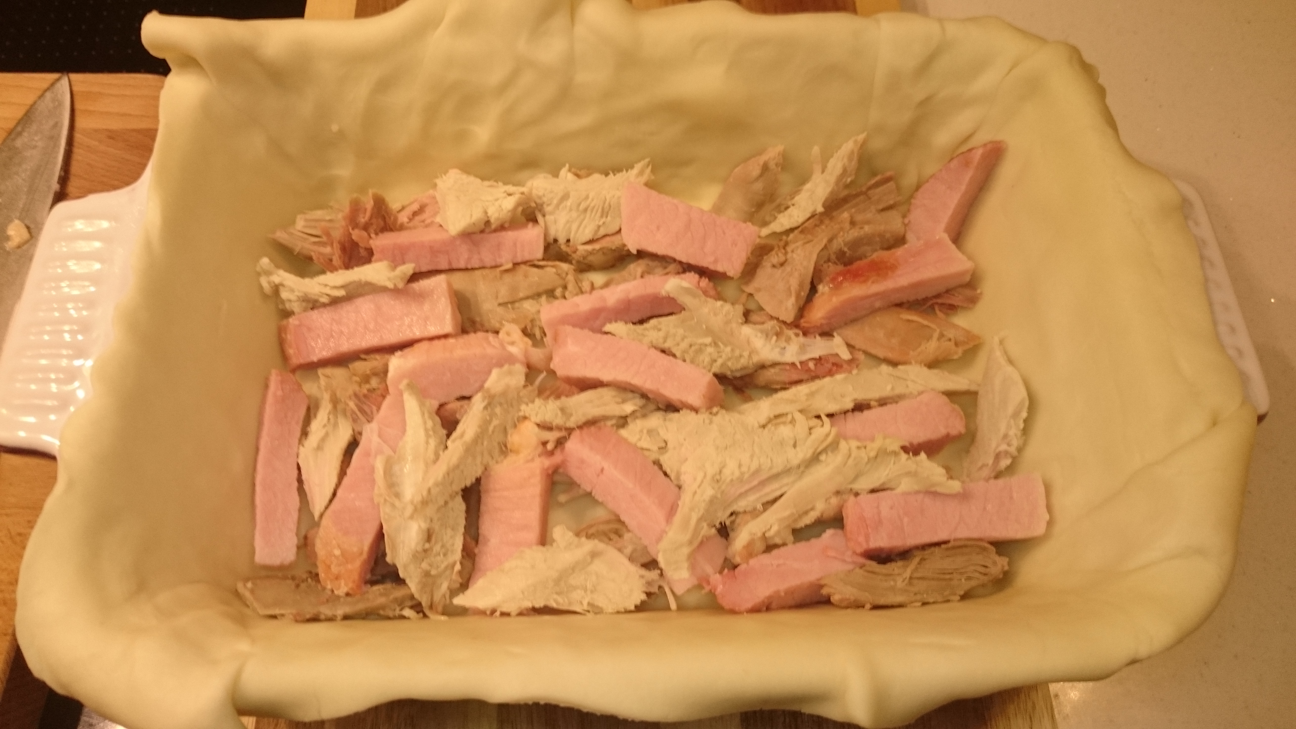 Place a thick layer of meat in the base of the pie, combining ham with dark and white turkey. Cover with half the cream mixture. Repeat again with another layer of meat and the remaining cream mixture.