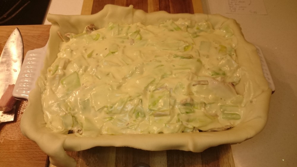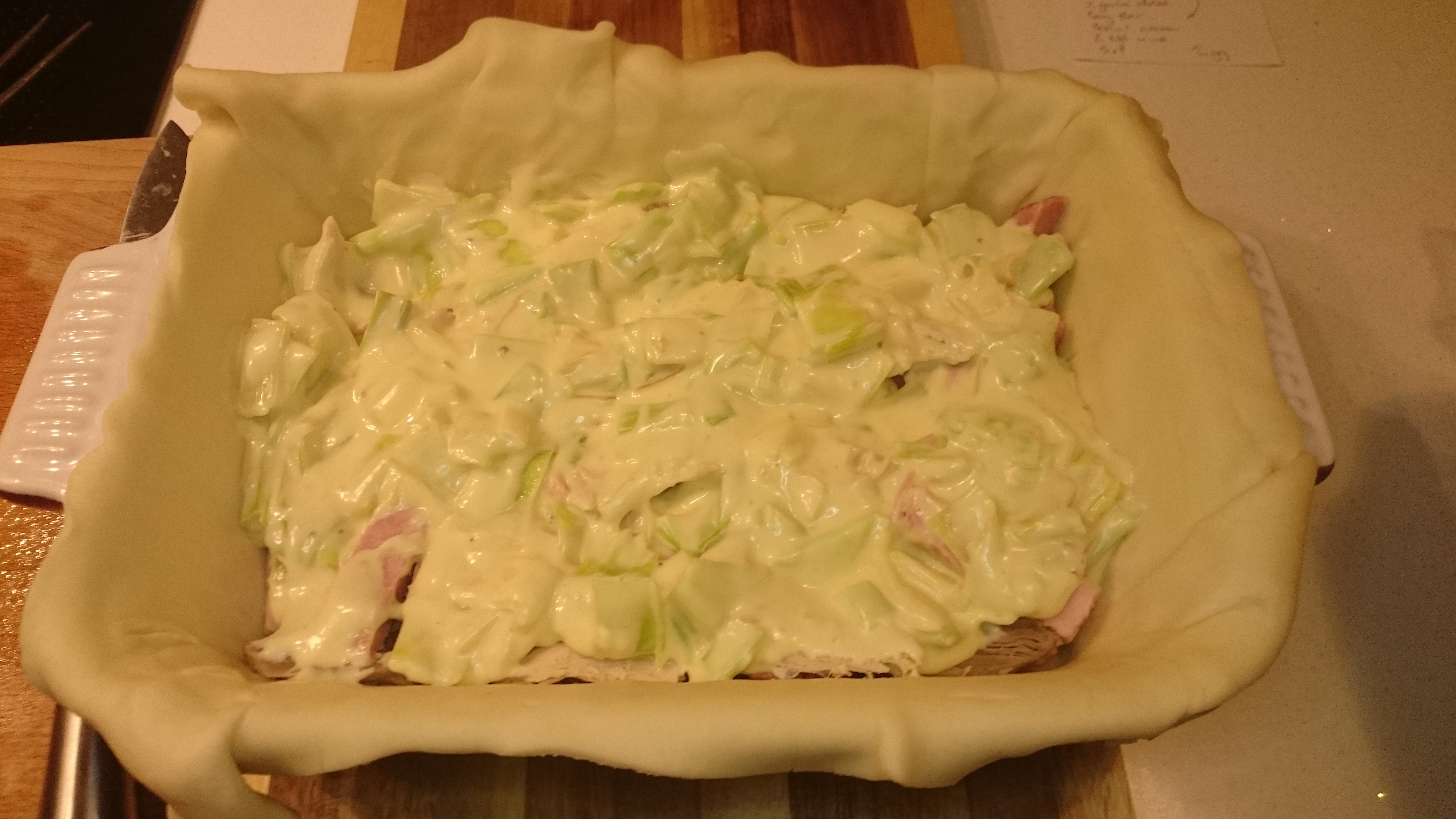 Pre-heat the oven to 180 degrees. Take a pie or casserole dish slightly smaller than the sheets of pastry and around 4cm deep. Grease well with butter.