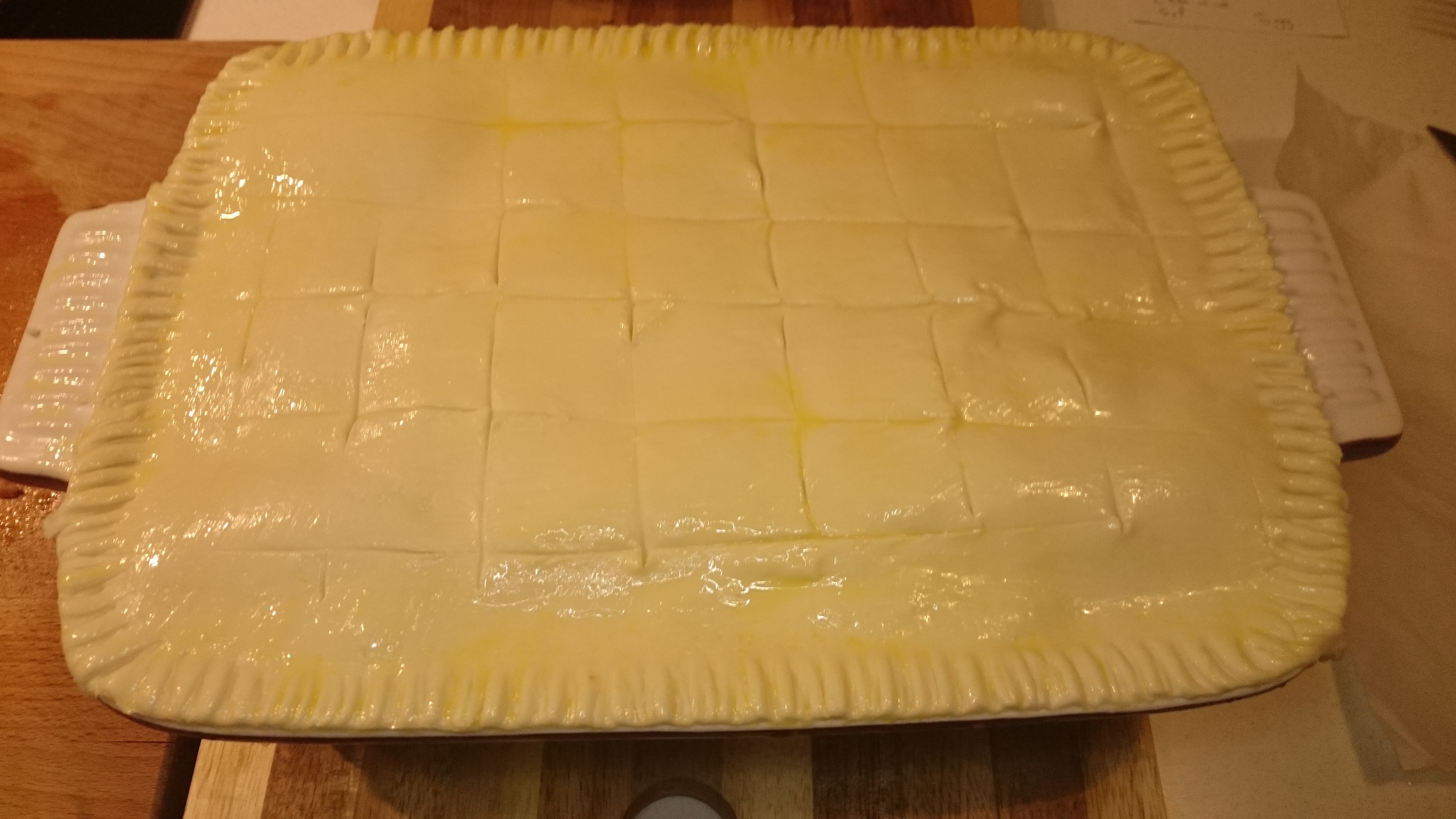 Beat the egg and brush the edges of the pastry in the dish. Unroll the puff pastry sheet and carefully layer over the pie. Press the edges down with a fork to seal and cut off any excess pasty. Lightly score the top in a criss-cross pattern and brush all over with egg.