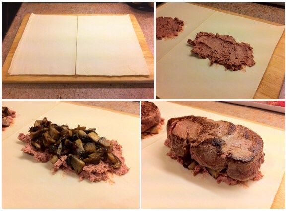 Open up the pastry sheet and cut down the middle of the longer side as shown, to give two square-ish rectangles. In the middle of each block, spread a little pâté, to around 5mm thick, about the same size as the steak. Then, add a covering of the onion/mushroom mix to the top of the pâté. Don’t worry if you have some left over. Place the steaks on top.