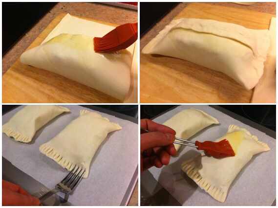 Transfer to the baking tray (keeping the seal side down) and brush the tops, ends and sides with egg. If you’re feeling creative, use any remaining pastry to cut out a shape for the top of each parcel. I did a heart for Valentine’s but you could do anything! Brush that with egg on both sides and stick onto the top of the parcels. Place the baking sheet in the oven.