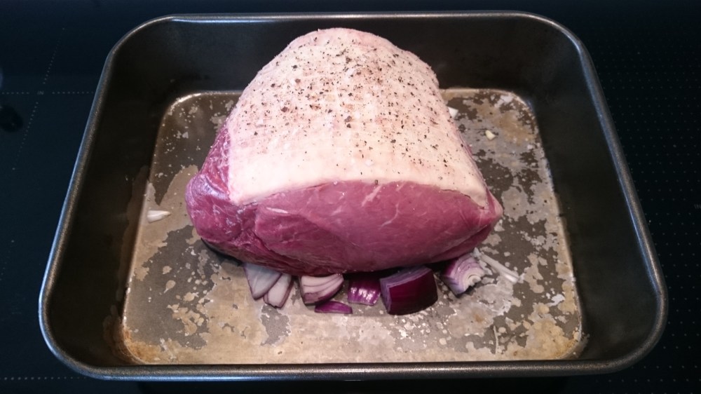 In a roasting tin, put a layer of roughly chopped red onions, 2 or 3 should be enough. Rest the joint on top and liberally season with salt and pepper. Cover with foil and pop in the oven.