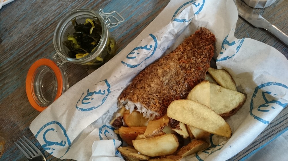 It was all wonderful. The fish and coatings were full of flavour, the dips (especially the homemade tartar sauce) fantastic. The chips are sliced flat wedges seasoned in seaweed salt so not your traditional chip but actually very good.