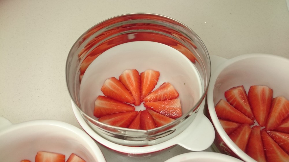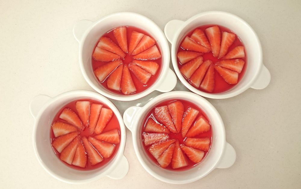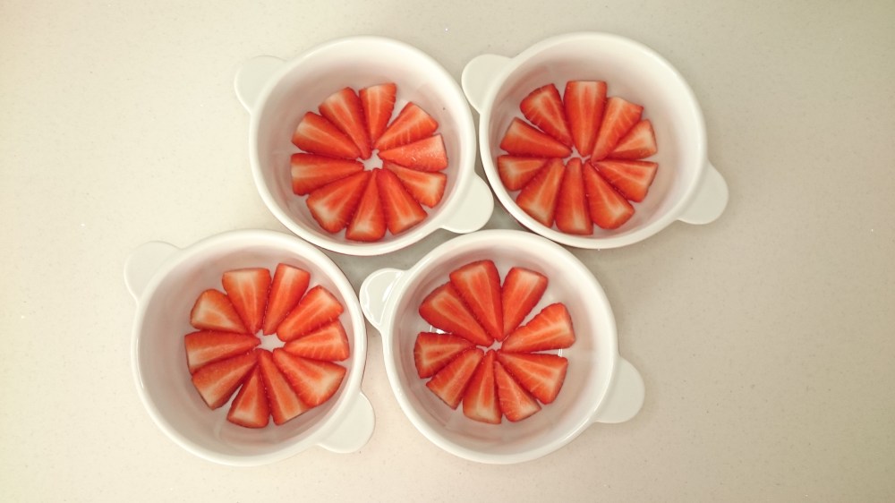 If gaps appear in your strawberry ‘flower’, in fill these with an extra strawberry or two. Carefully place the bowls in the fridge to set.
